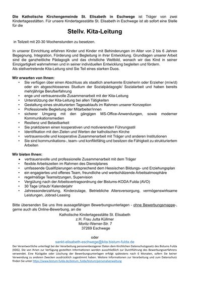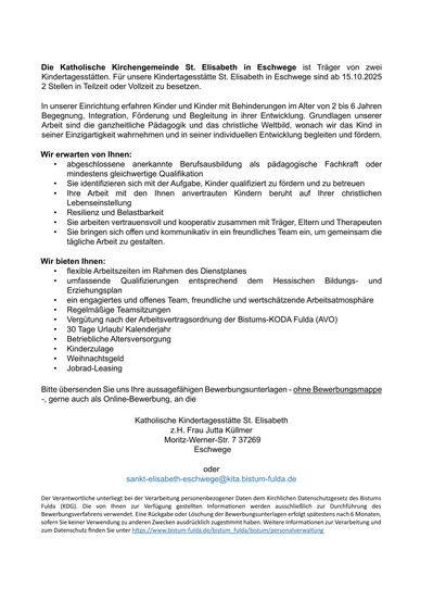 Aktuelle Stellenausschreibungen in der Pfarrei St. Elisabeth